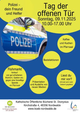 Am Sonntag, 09. 11.2025, öffnen wir unsere Türen für einen “Tag der offenen Tür” zum Thema “Polizei – dein Freund und Helfer”. Zwischen 10:00 und 17:00 Uhr sind alle herzlich eingeladen, die vielseitigen Angebote von Büchern, Spielen, Tonie’s und Edurino’s bis hin zu digitalen Angeboten zu entdecken und einen aufregenden Tag bei uns zu verbringen. Im Pfarrsaal ist für das leibliche Wohl mit Kaffee und Kuchen gesorgt und beim Bücherflohmarkt kann nach gut erhaltenen Büchern, Spiele und mehr gestöbert werden. In der Bücherei gibt es Bastelaktionen passend zum Thema und die neuesten Bücher werden dort präsentiert und können direkt ausgeliehen werden.