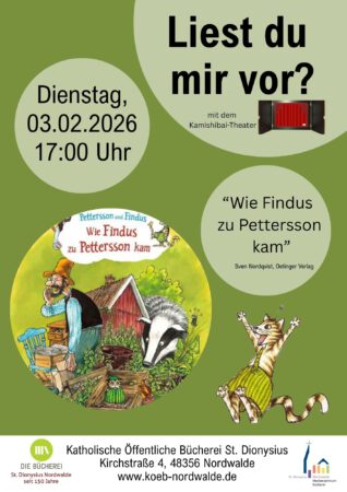 Am Dienstag, 03.02.26 findet in diesem Jahr das erste mal unsere Leseaktion „Liest du mir vor? statt. Um 17.00 Uhr sind alle 4- bis 6-jähringen Kinder eingeladen die Geschichte „Wie Findus zu Pettersson kam“ dem Kamishibai-Theater zu erleben.